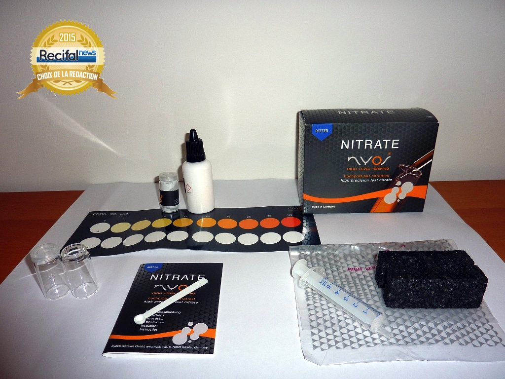 Nyos propose un nouveau produit pour le test des Nitrates dans les bacs Marins, ce kit permet environ 40 tests sur des plages de 1 à 160 ml/l de NO3. b92 constate qu’il est très facile à utiliser, mais aussi que l’on réalise ce test sur des volumes d’eau assez importants (comparativement à d’autres tests) en utilisant des volumes de réactifs pas trop petits. Cela peut participer à la ‘répétabilité’ des mesures. Enfin en utilisant l’eau du bac en référence pour la comparaison des couleurs, en particulier pour ceux qui ont de l’eau un peu jaunâtre. Ceci est un avantage vu que la couleur des tests donne des résultats dans le jaune aussi. Ce kit est proposé pour un prix public généralement constaté de 25 €.
