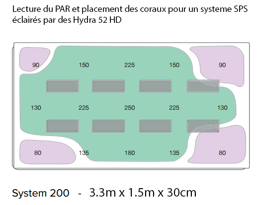 En regardant le système d’aquaculture SPS de WWC, éclairé par des rampes AquaIllumination Hydra 52HDs, on peut remarquer un autre concept fondamental de l’éclairage du bac. Dû aux différents niveaux de PAR, WWC place les différentes espèces en fonctions de leurs besoins. Par exemple, les acroporas d’eau peu profonde sont placés sur la partie centrale où l’éclairage est le plus fort. Dans le coin où le PAR est le plus bas WWC cultive leur Zoanthus. Notez que le PAR est inférieur à ce qui est habituellement conseillés pour les SPS à haute luminosité. Cela est dû à une période d’éclairage plus longue que les 8 à 10 heures utilisées par la majorité des amateurs.