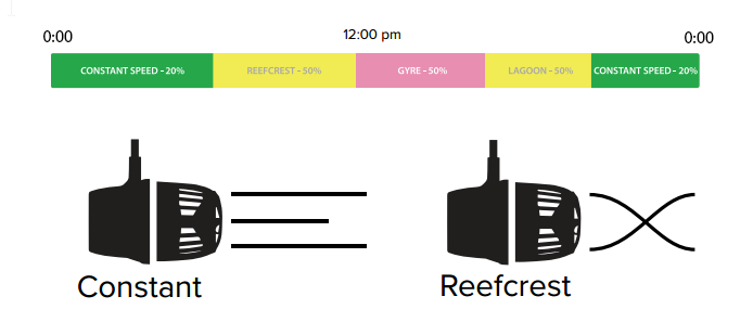 Le mode ‘Reef Crest Random’ simule un environnement de récifs à haute énergie. La pompe changera de vitesse fréquemment et drastiquement pour simuler les vagues qui s’écrasent. C’est le mode favori pour les coraux SPS.