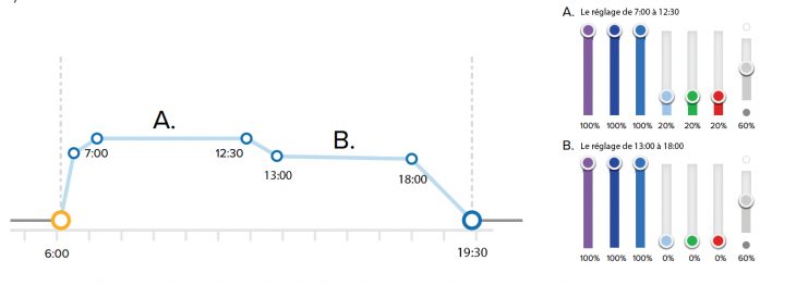 World Wide Corals utilise des systèmes seulement Led ou autrement Led en combo avec des HQI ou des tubes T5. Les aquariums de ventes utilisent des rampes XR30w Pro G2 et XR30w Pro G3. Ils utilisent le programme suivant :