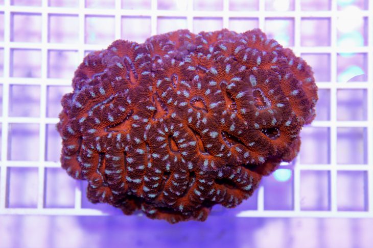 N° 1 : Ce très bel Acanthastrea lordhowensis de plus d’une vingtaine de têtes arbore un joli camaïeu de rouge rehaussé d’un bleu gris pale !
