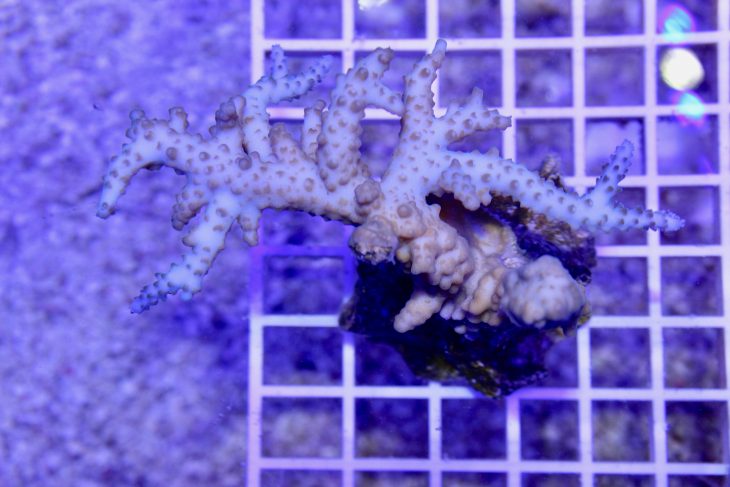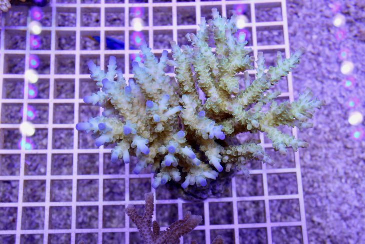 N° 2 : Un Acropora formosa atypique, à dominante pâle et aux belles pointes bleu nuit ! De quoi détonner dans un bac de sps flashy.