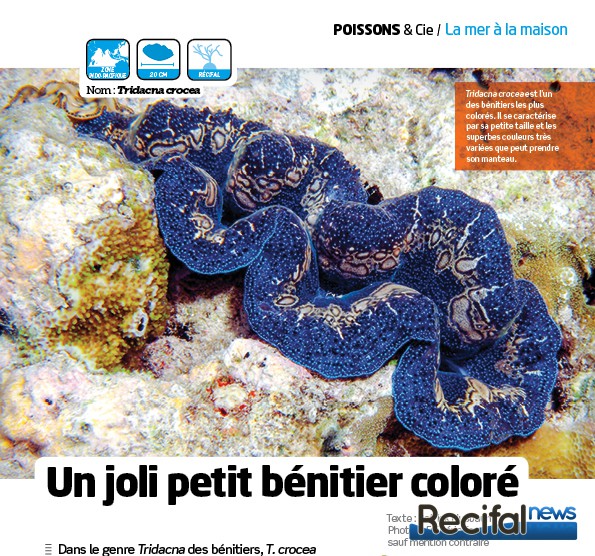 Après l’article sur les coraux mous, L’aquarium à la maison n° 119 vous présente une espèce de bénitiers particulière : Tridacna crocea.