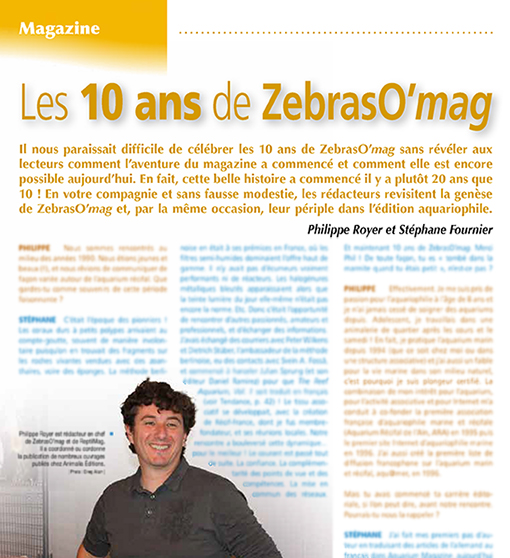 Enfin, Philippe Royer et Stéphane Fournier nous partagent leur ressenti sur le développement de l’aquariophilie récifale de nos jours et comment ils voient l’avenir de ZebrasOmag. Une chose est sûre : ils mettent en avant leur expérience, leur passion et leur volonté de partager pour conserver la qualité de ce magazine et en faire une référence.