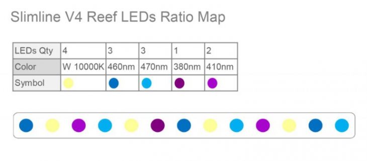 Voici les couleurs et la répartition des LED sur le modèle récifal :