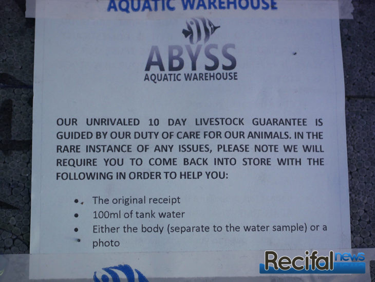 Une chose que je n’avais pas encore vue jusqu’ici : Abyss Aquatic Warehouse garantissent leurs poissons et coraux 10 jours après achat en ramenant la facture, de l’eau de votre aquarium et soit l’animal en question, soit une photo de l’animal mort.