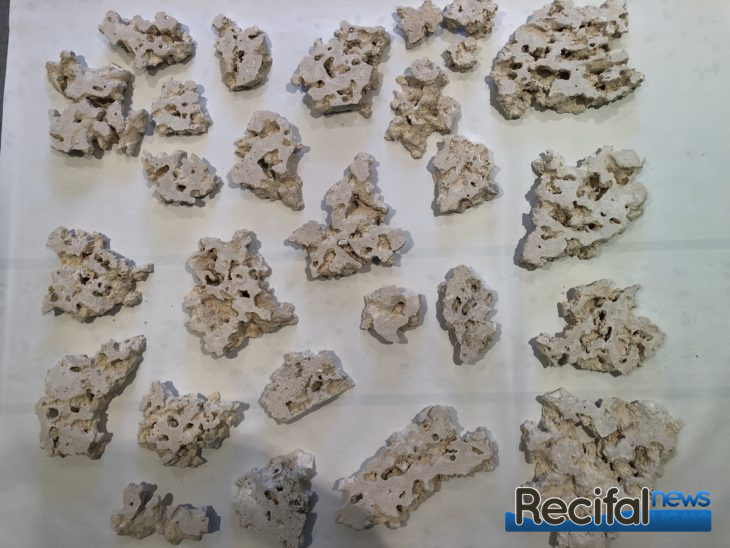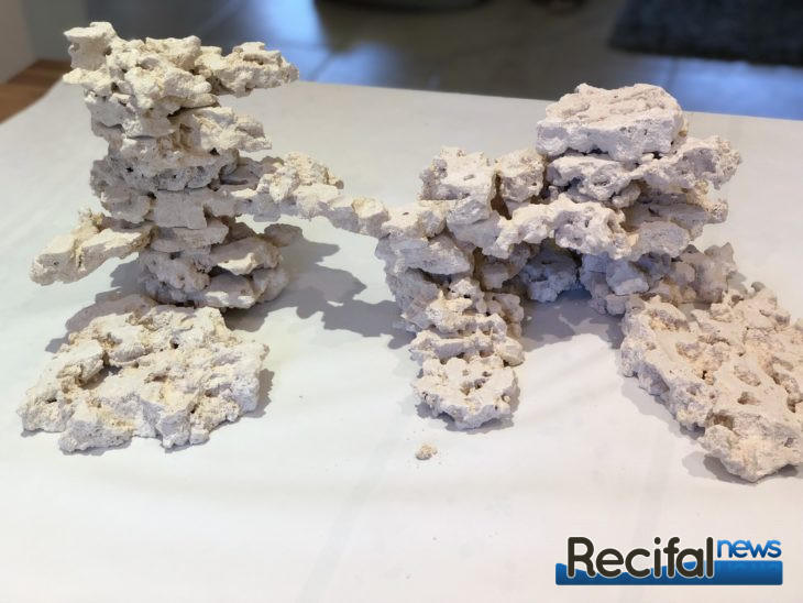 Malgré le fait que ce produit soit apparu en 2017 outre-Atlantique, je dois avouer qu’il a été relativement difficile de se procurer ces deux boites de Lego pour grands enfants aquariophiles responsables. Sachez que ce n’est plus Aquarium Systems qui est en charge de distribuer les produits de chez Two Little Fishies, mais bien De Jong Marinelife. Et c’est donc grâce à Julien de Reef Depot que je reçois mes colis en point relais : 2 cartons de Stax de 20 lb (soit 9,1 kg) et le ciment pour fixer tout ça. Impossible de se procurer ce fameux ciment appelé STIX mais en lieu et place, le ciment E-Marco-400 qui serait exactement le même produit selon De Jong. Car oui, les Stax ne sont ni plus ni moins que des Marco Rocks taillées en tranches épaisses.