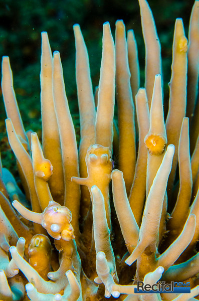 Cette espèce est tellement unique, qu’il suffit de la voir une seule fois pour être capable de la reconnaître. Il est pratiquement inutile de la décrire … Elle ne possède pratiquement pas de corallites radiales, mais seulement des corallites axiales effilées, coniques et extrêmement longues. Elles peuvent atteindre une dizaine de centimètres de long. C’est ça qui la rend unique. Seule quelques corallites radiales naissantes apparaissent à la base des corallites axiales. Les colonies sont corymbes formant un plateaux horizontal d’où partent les corallites axiales longues et verticales.