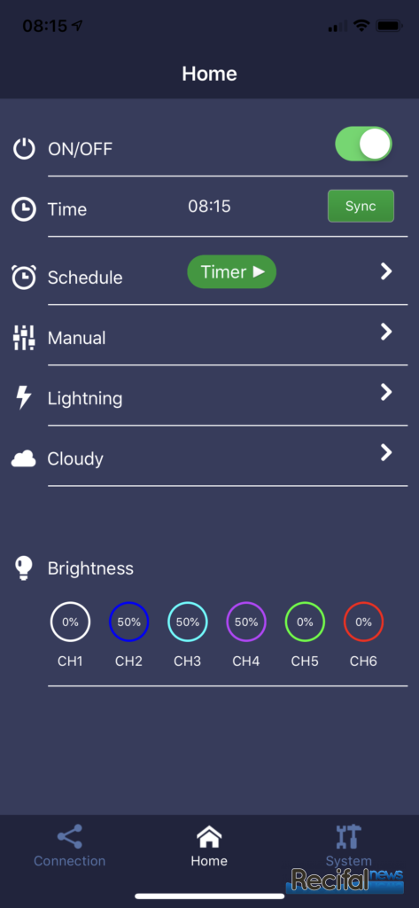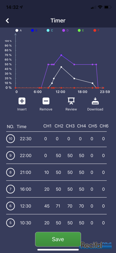 Là aussi c’est très simple : cela permet de régler une programmation (deux sont proposées par défaut : un programme SPS et un autre LPS). Une troisième option permet de créer une configuration personnalisée, ce que j’ai fait ici vu la taille de l’aquarium de test et le fait que je ne désire pas utiliser le vert et le rouge mais uniquement les LED bleues, blanches et le violettes.