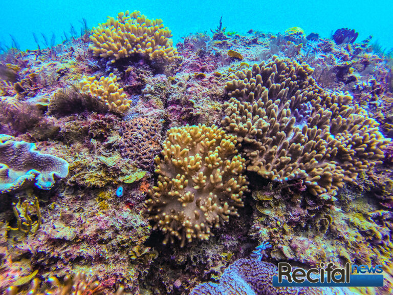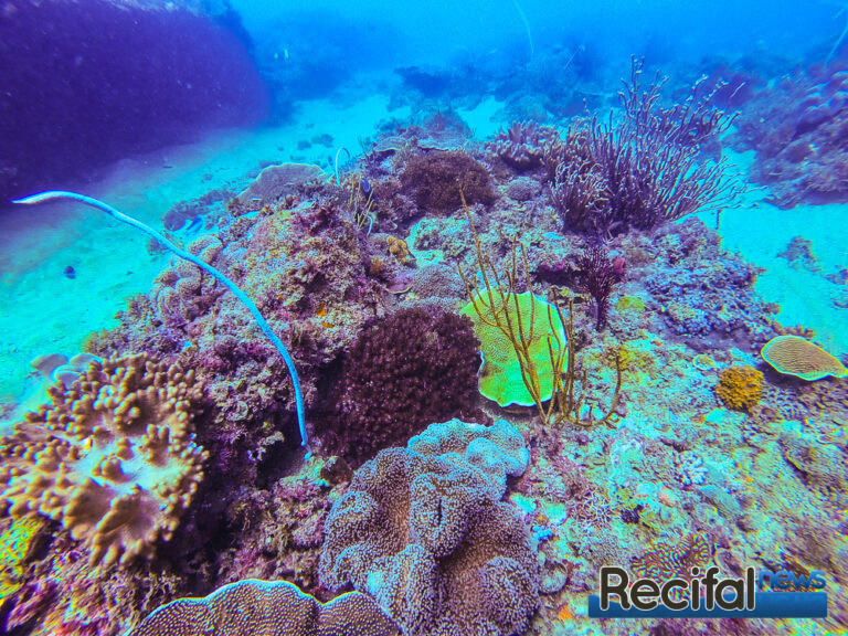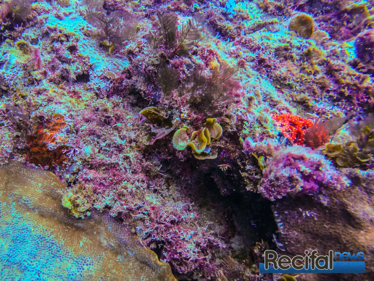 Sous l’eau c’est les coraux mous de type Sarcophyton et Lobophytum qui dominent le paysage. Dans la zone un peu plus profonde on trouvera pas mal de gorgones. Les coraux mous résistent aux assauts des vagues beaucoup mieux que les coraux durs, et bénéficient largement de la turbidité de l’eau et l’immense apport de nourriture. La seule autre espèce qui est vraiment présente est Turbinaria mesenterina, dont le squelette très dense et la forme de coupe, lui permet de résister aux lames raclant ces rochers.