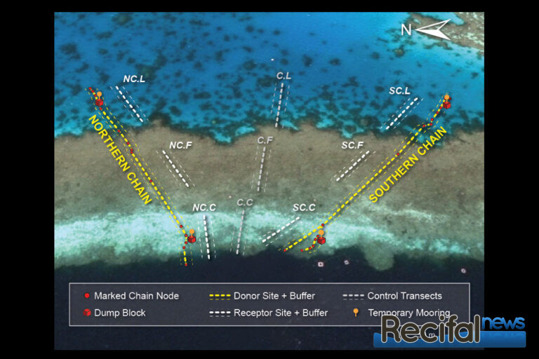 Ainsi le ponton reefworld qui a subi des dommages importants lors du cyclone Debbie le 27 Mars 2017 a été enlevé pour être réparé et modifié. Ses ancrages, qui ne seront pas réutilisés car le ponton sera déplacé, et un nouveau système d’ancrage utilisé, doivent être enlevés. Conformément à la réglementation dans le parc marin de la grande barrière de corail ils doivent être enlevés sans endommager d’animaux. Hors ces deux ancrages de plus de 200 m de long ainsi que les blocs de bétons qui les soutiennent étaient recouverts de coraux. Tous les coraux ont dû être enlevés et déplacés à une dizaine de mètres de distance.