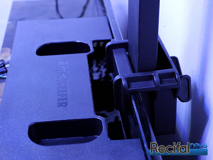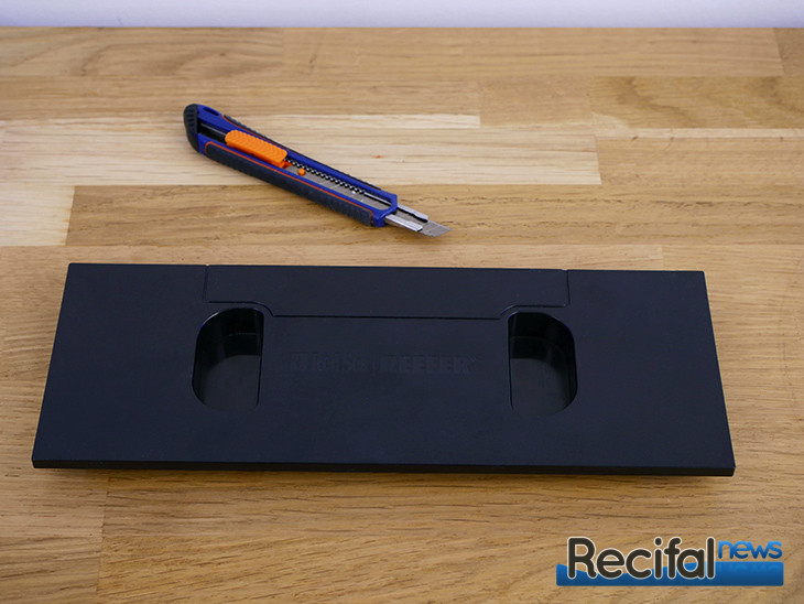 Enfin, l’empattement de base se serre à la vitre de votre aquarium grâce aux vis papillons qui viennent alors plaquer le pied de fixation contre la vitre de l’aquarium. Note aux possesseurs de modèles sur lesquels la ReefLED se fixe dans la colonne de débordement ; il est nécessaire de découper son couvercle. Pour cela, passer un coup de lame de cutter le long du sillon pré tracé et quelques mouvements du haut vers le bas suffisent.