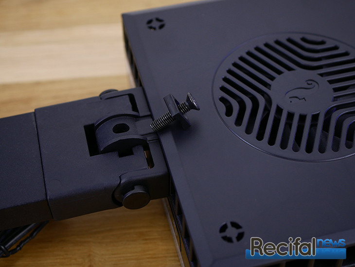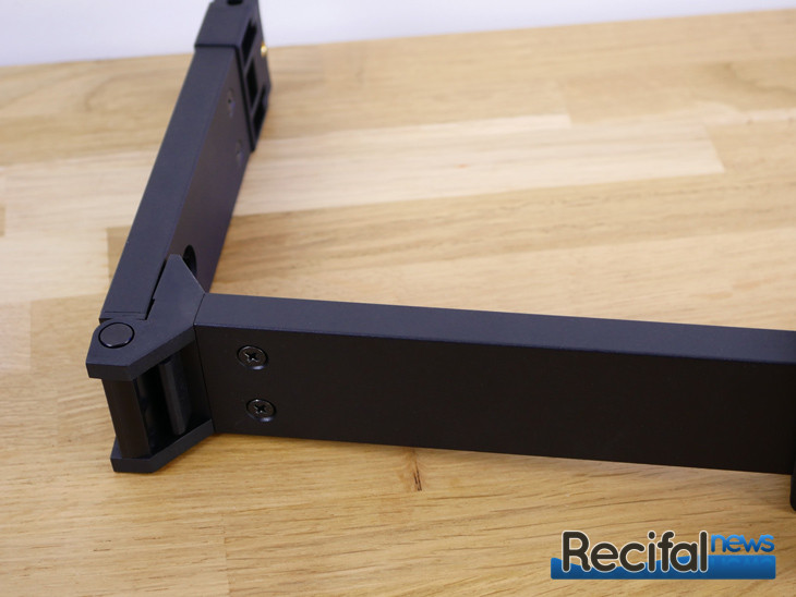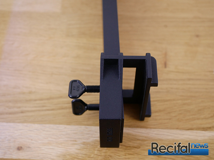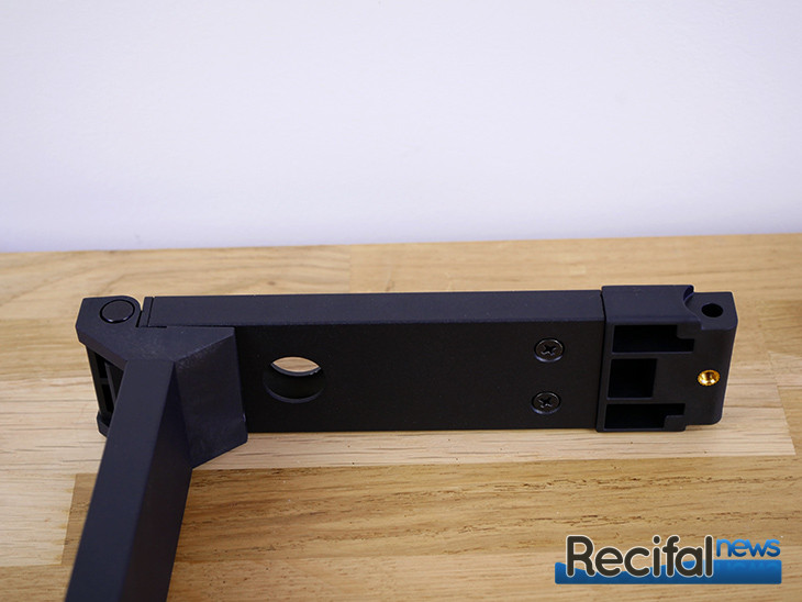 Deuxième étape, visser la patte d’accroche sur l’arrière de la ReefLED. Puis venir l’enclencher sur la platine précédemment vissée à l’extrémité du bras horizontal. Insérer les vis plastiques sur les côtés. Enfin, visser la petite pièce carrée et arquée qui permet d’affiner l’inclinaison de la rampe sur le pied.