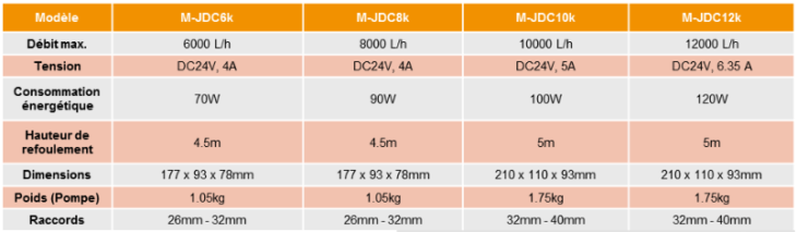 Quatre modèles de Maxspect DC Jump sont annoncés. Voici le tableau récapitulatif de leurs caractéristiques. On remarque que ces pompes sont assez compactes, ce qui est bien pratique dans les décantations de taille modérée !