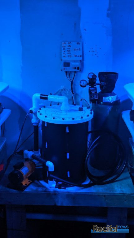 Chaque double rangée est connectée à une décante en polypropylène noire sous un des bassins dans laquelle les pompes redistribuent l’eau. Les produits Brightwell y sont utilisés ainsi que les pompes et lampes Ecotech et les écumeurs Reef Octopus, tous sponsors de la ferme.