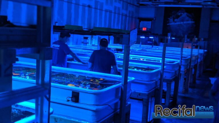 En plus, ils utilisent des Réacteurs à Calcaire. La technique est donc très simple, mais a aussi ses limites, puisque WWC n’est pas la meilleure boutique pour les SPS et ils galèrent même un peu. Même si ils rajoutent des T5 sur les bacs d’Acro, cela ne suffit pas vraiment quand on doit produire en grande quantités. La boutique voisine Top Shelf Aquatics est par contre spécialisée en SPS. Ils ne font que cela et utilisent la méthode Triton avec refuge. Mais pour les LPS, cette technique très simple marche très bien et ils produisent énormément de coraux.