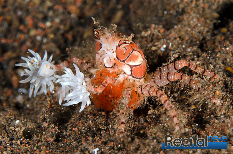 Ce crabe de la famille des Xanthidae est tout à fait incroyable de par sa coloration. Composée de mosaïques de blanc, rose, orange, et rouge sur le corps avec des pattes zébrées de violet sur fond rose pâle.