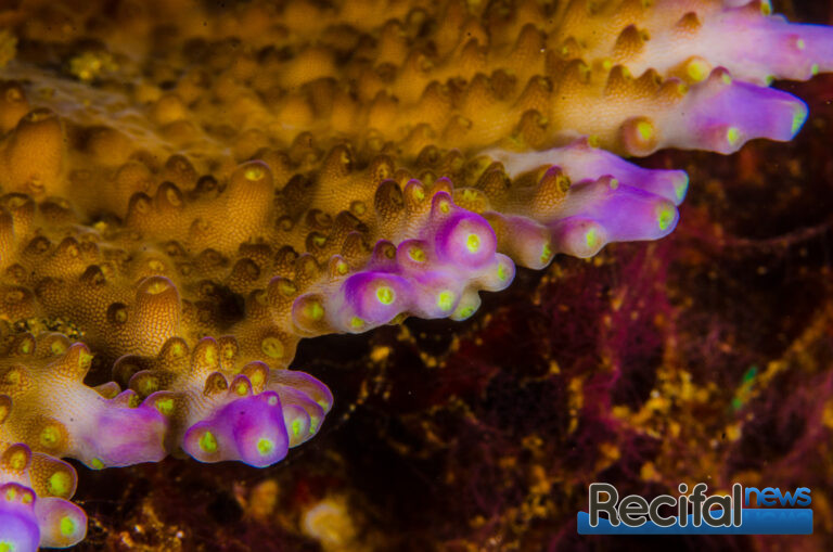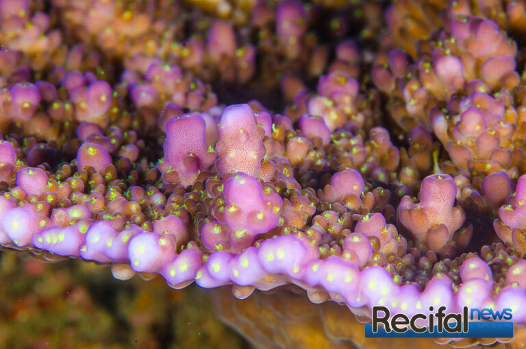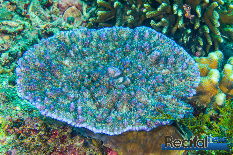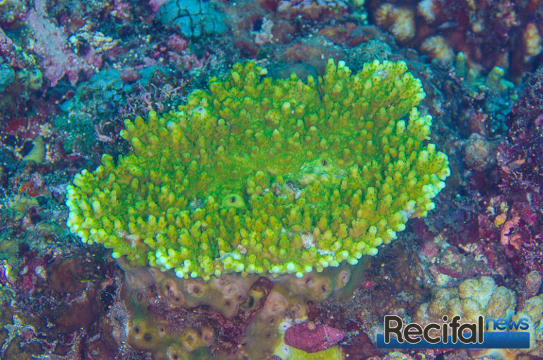 La coloration principale est brune avec les corallites axiales violettes et les tentacules des polypes jaunes ou verts fluorescents. L’autre coloration assez classique est toute verte avec les tentacules jaunes ou verts fluorescens.