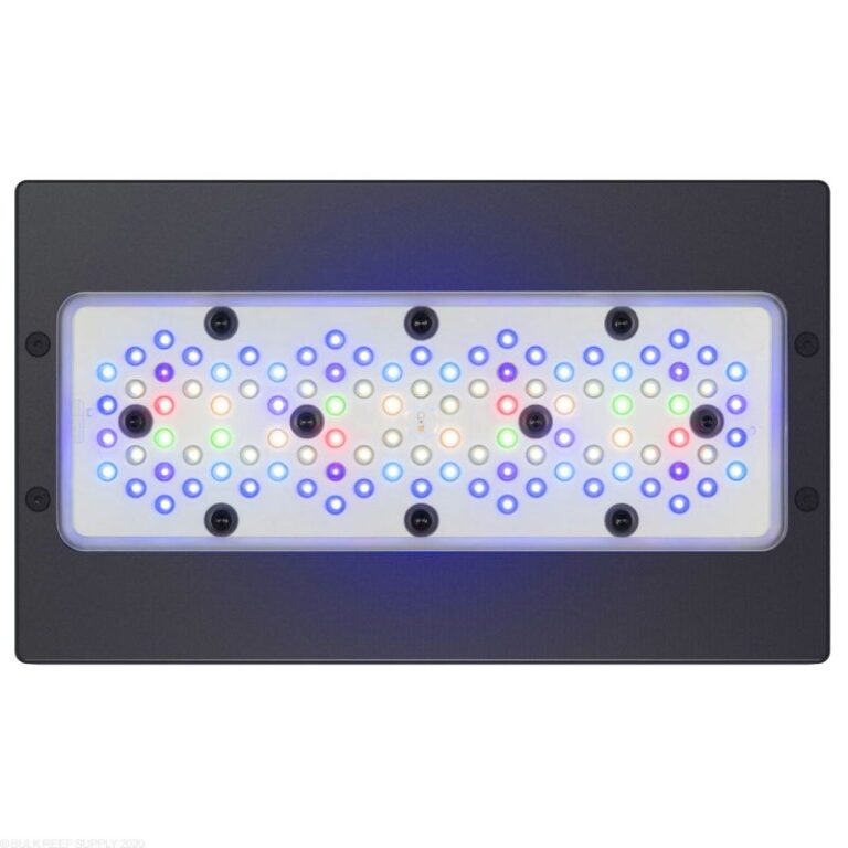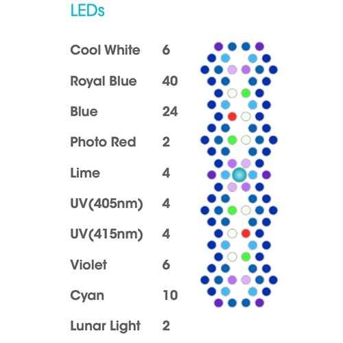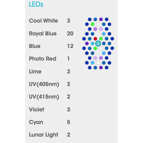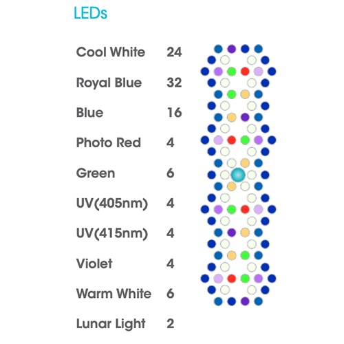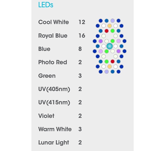 Les rampes utilisent des lentilles HEI (Hemispherica Edge Illumination) apparues sur la génération précédente (G4) et optimisées pour cette nouvelle version. Ces lentilles permettent de diffuser plus largement le flux de lumière afin d’éviter de créer une zone de PAR élevée directement à l’aplomb du cluster. Les zones d’ombre sont réduites et l’espace utilisable par les coraux est donc augmenté à toutes les profondeurs.