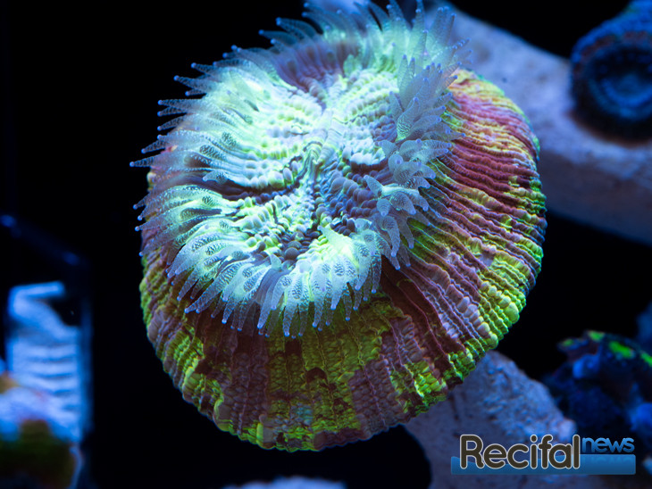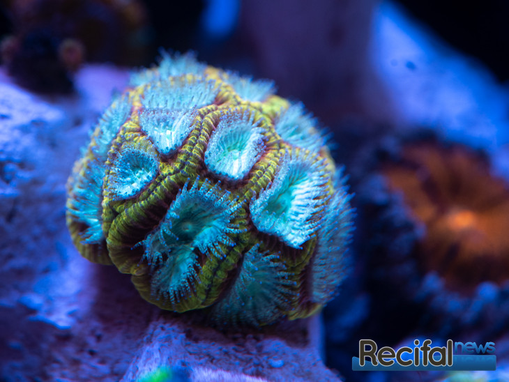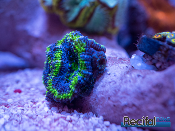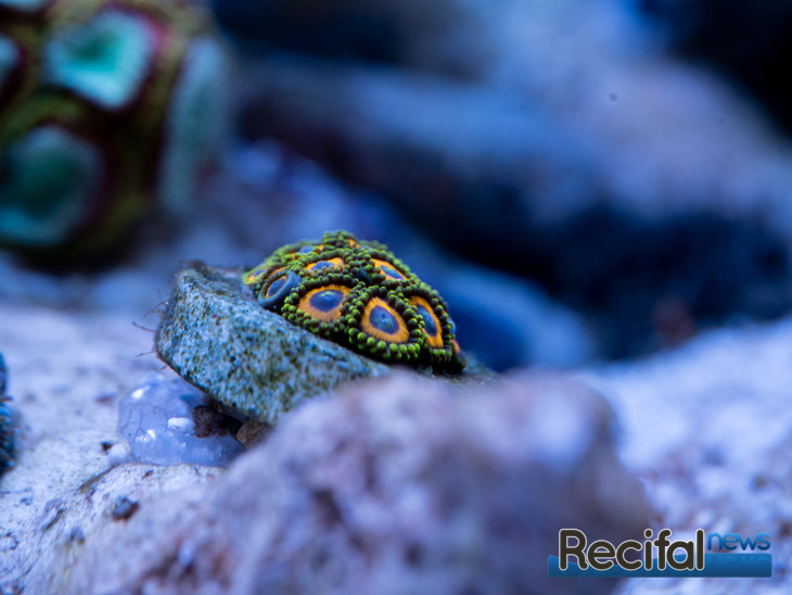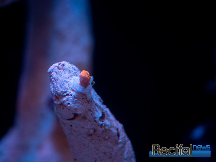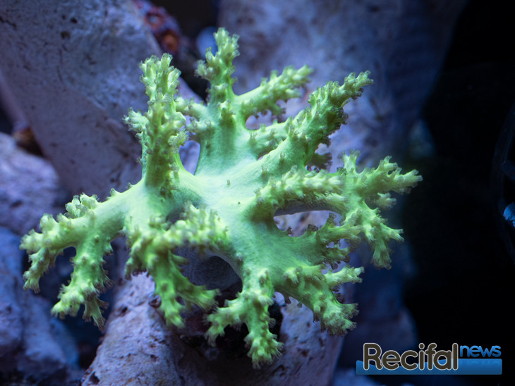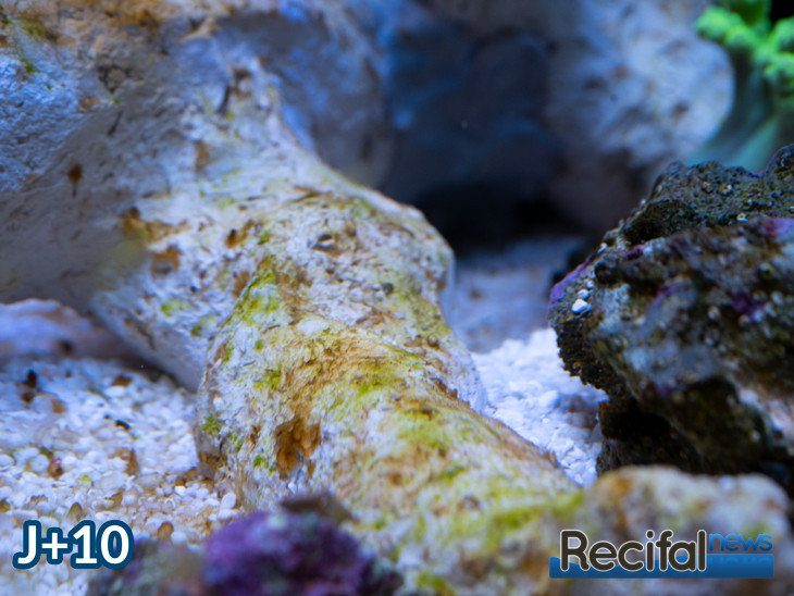 Au fil des ajouts de bactéries et du nourrissage des détritivores et du poisson, les algues continuent à se développer. Le Zoanthus mis le septième jour se portant bien, je décide d’ajouter un Sinularia vert le dixième jour :