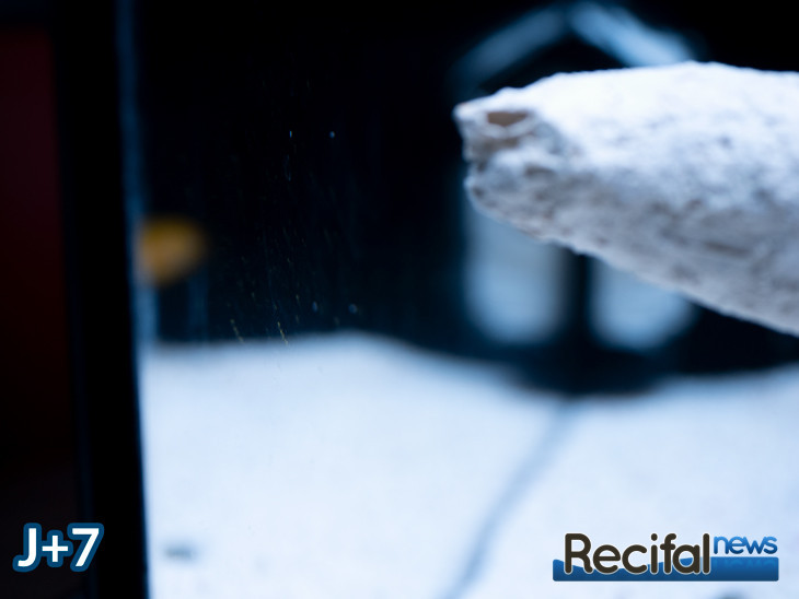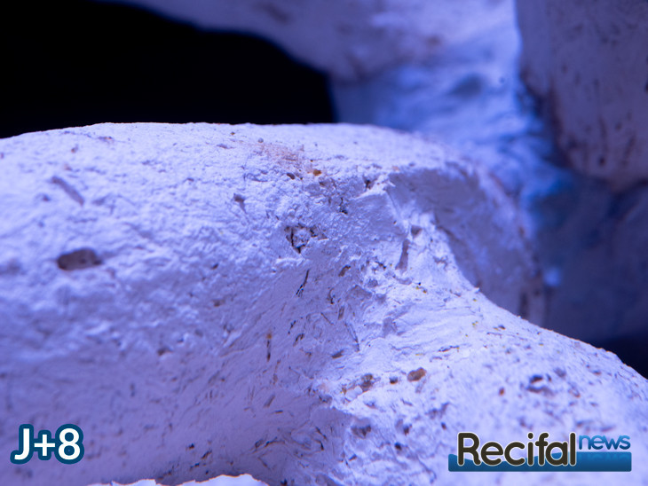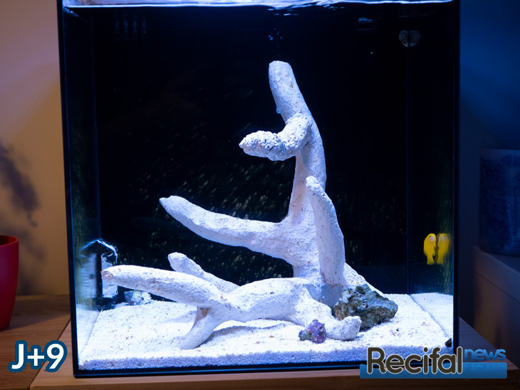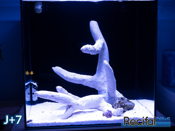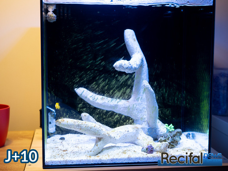 Démarré uniquement avec des supports inertes, la vie s’est mise en place petit à petit. Les premières algues sont apparues le septième jour, sur les vitres puis sur les céramiques Arka le huitième jour. J’ai alors ajouté une première bouture test d’un polype de Zoanthus ainsi qu’un fragment de roche pour apporter de la coralline et d’autres formes de vie, en m’assurant qu’elle ne portait pas d’indésirables comme Aiptasia, Valonia.