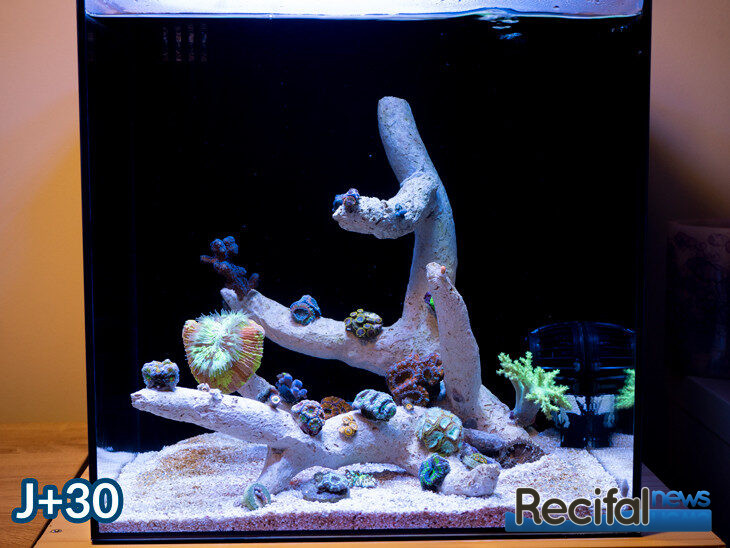 Pour les plus observateurs, quelques algues sont réapparues sur le sable au trentième jour. Elles sont apparues suite à l’ajout de quelques gouttes d’acides aminés pour nourrir les coraux. L’aquarium n’est pas assez mature pour encaisser un tel ajout pour le moment, mais ceci n’a pas eu de conséquences sur le vivant, mais a été un très bon indicateur des limites de cette méthode. J’ai également du retirer le Gobiodon okinawae qui s’est avéré très (trop !) friand des Micromussa / Acanthastrea. Enfin, j’ai ajouté une pompe de brassage Vortech MP10 Quiet Drive pour assurer un brassage pulsé.
