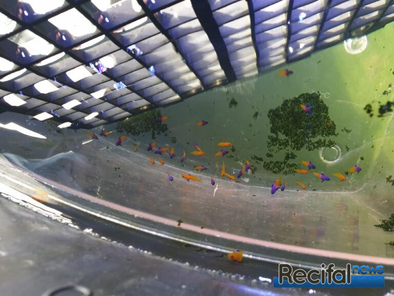 La particularité de cet élevage larvaire, est qu’ils ont, afin de rentabiliser au maximum, élevé deux pontes de poissons différents: G. loretto et G. dejongi. Beaucoup d’éleveurs pratiquent cette technique. Malheureusement; si une des espèces grossit plus vite elle domine la seconde, donc il y a quand même un petit risque. Comme les deux espèces dans ce cas font partie du même genre, le risque est faible. On voulait partager avec vous quelques photos et vidéo de ces beaux petits poissons qui seront bientôt disponibles chez quelques revendeurs sélectionnés. Leur coloration est remarquable, et leur activité intense, ce qui sont deux très bons signes d’une excellente qualité.