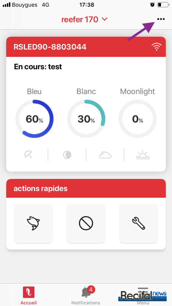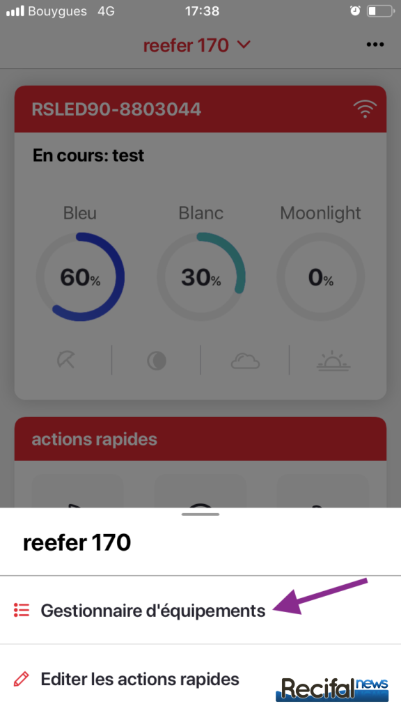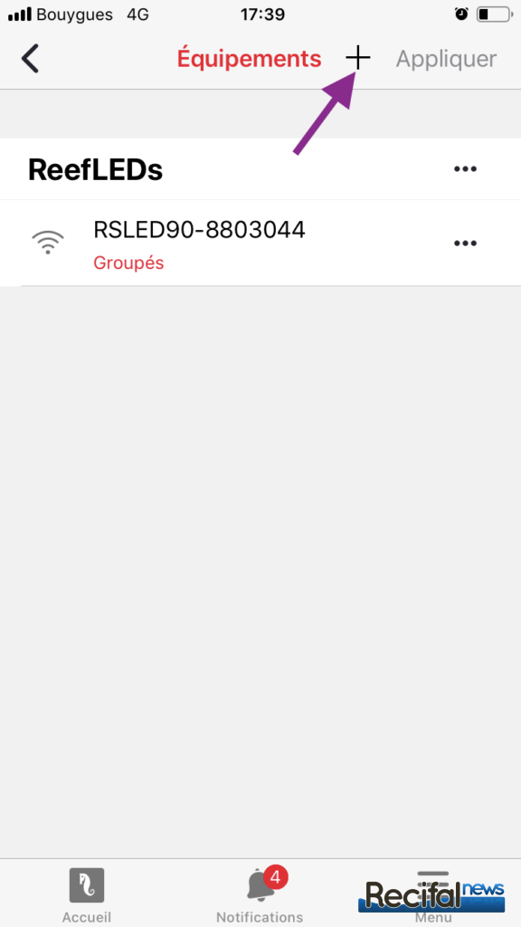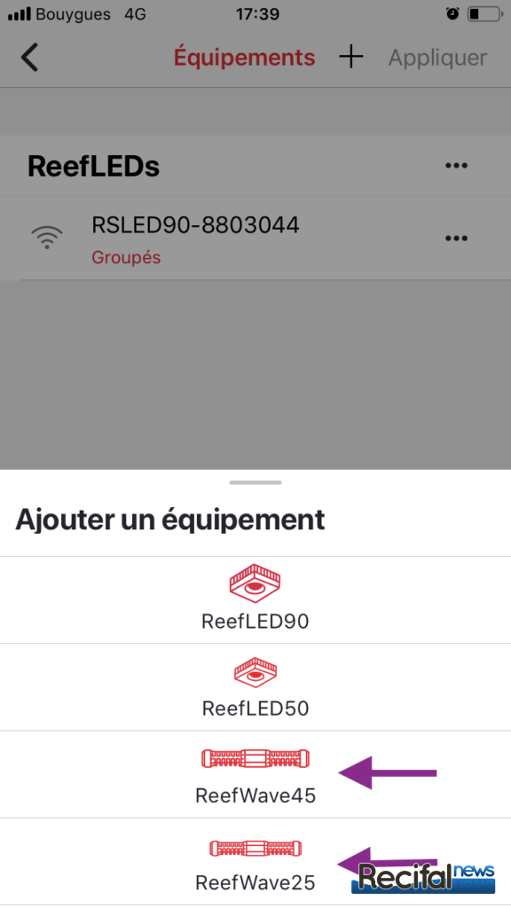 Sans cela, vous ne pourrez ajouter de Reef Wave dans le gestionnaire d’équipement qui permet la connexion de vos différents appareils au sein de votre aquarium. Une fois la mise à jour faite, rendez vous sur la page de l’aquarium où est installé la Reef Wave, cliquez sur les « … » en haut à droite, puis sur « Gestionnaire d’équipement ». Sur la page des équipement, le « + » en haut à droite permet d’ajouter un appareil. Sélectionnez le modèle de Reef Wave correspondant.