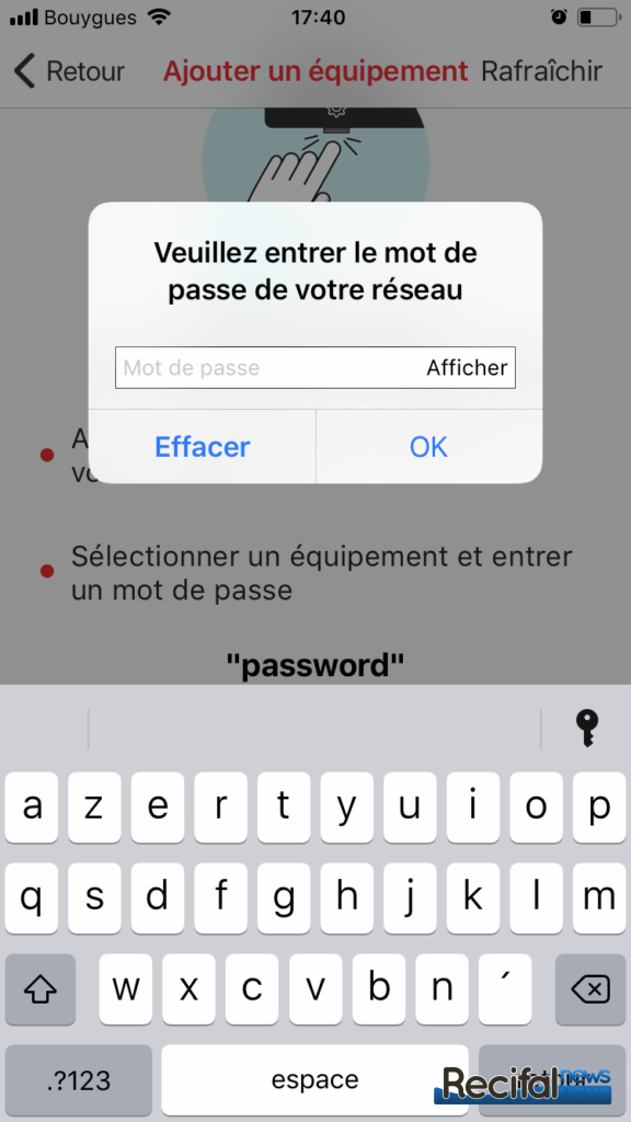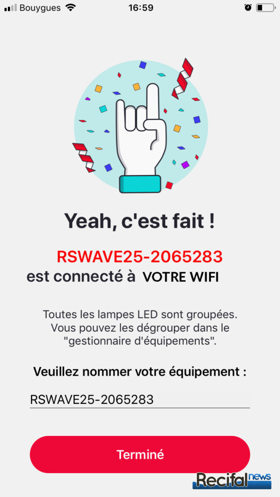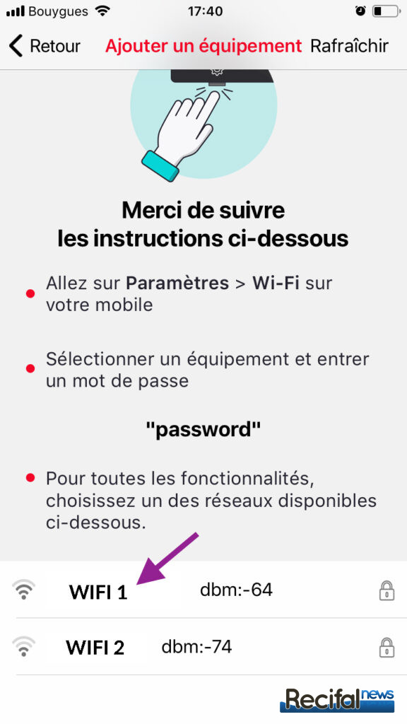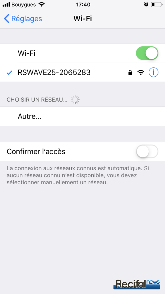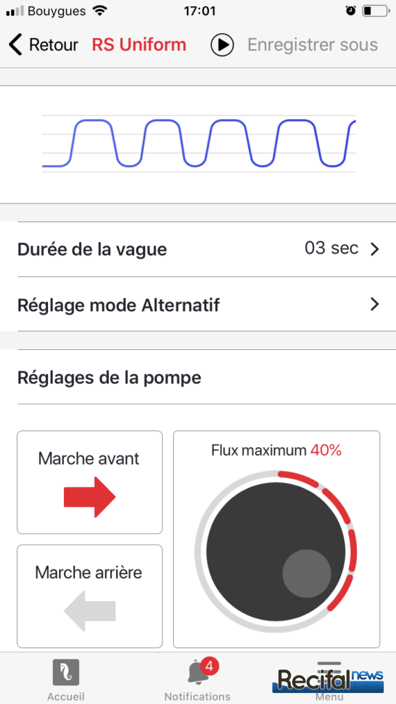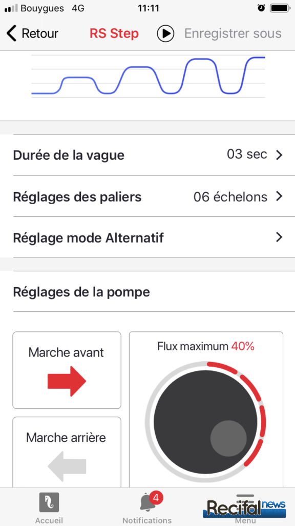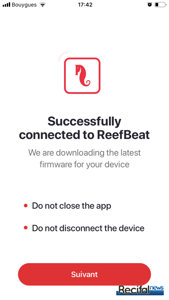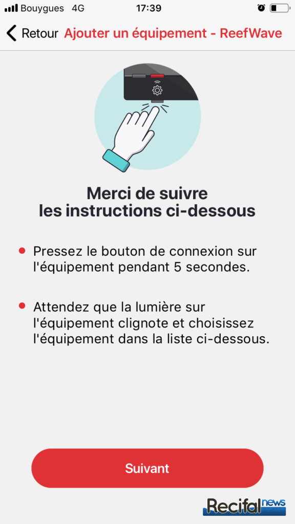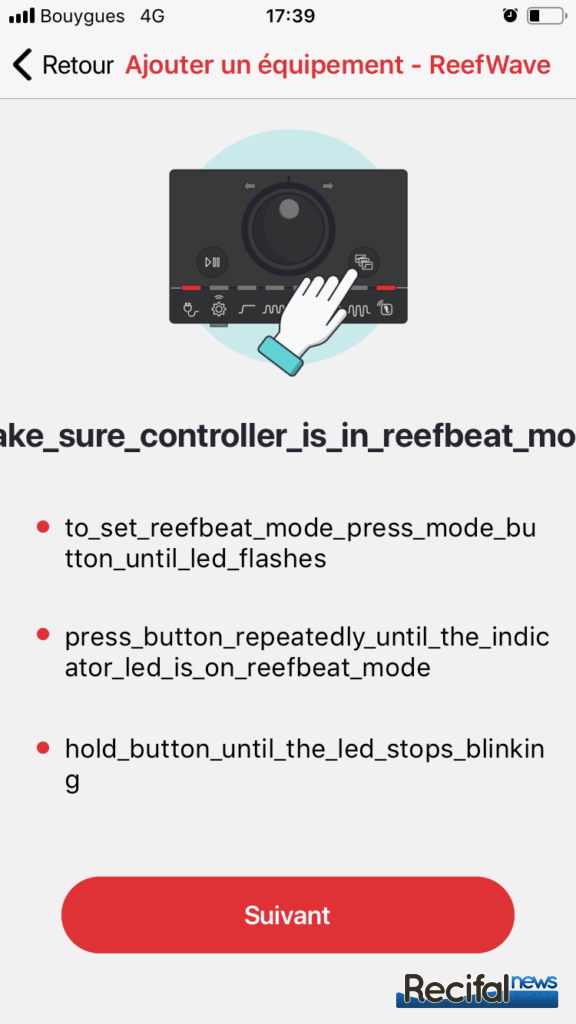 Pour la suite des étapes, deux actions sont nécessaires sur le boîtier de contrôle de la Reef Wave : à l’aide du bouton de sélection de mode, sélectionnez le mode « Reefbeat », tout à droite. Puis sous le boîtier, appuyez sur le bouton Wifi quelques secondes jusqu’à ce que l’indicateur Wifi clignote. Dans les paramètres de connexion de votre appareil mobile, connectez-vous au Wifi portant le nom de la pompe, le mot de passe par défaut est « password ». Retournez sur l’application Reefbeat, et vous pourrez vous connecter à votre réseau internet domestique. Une mise à jour du firmware de la pompe est effectuée, et la Reef Wave est connectée !