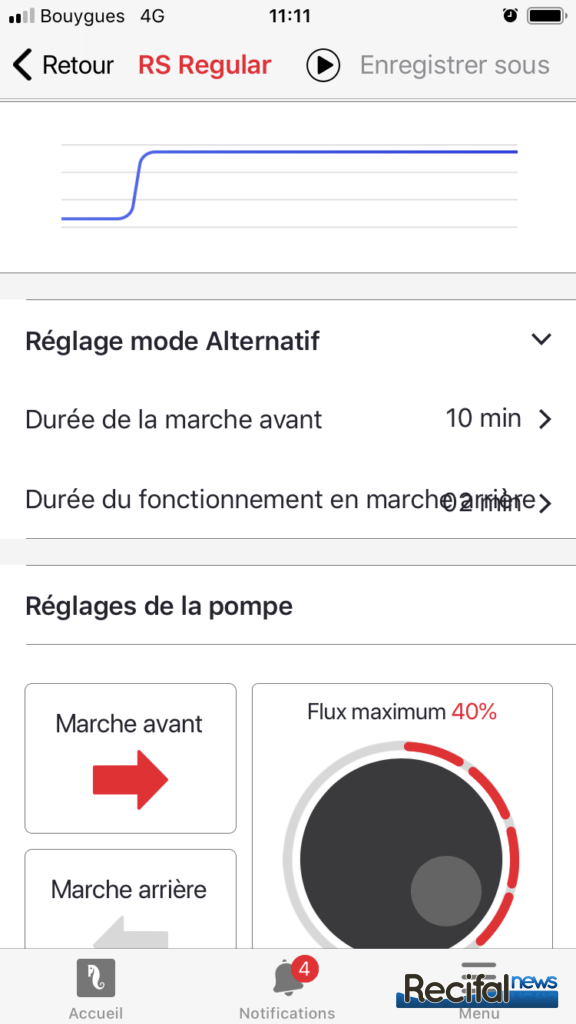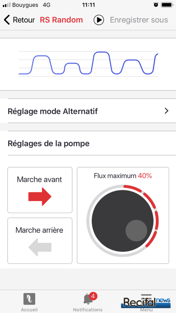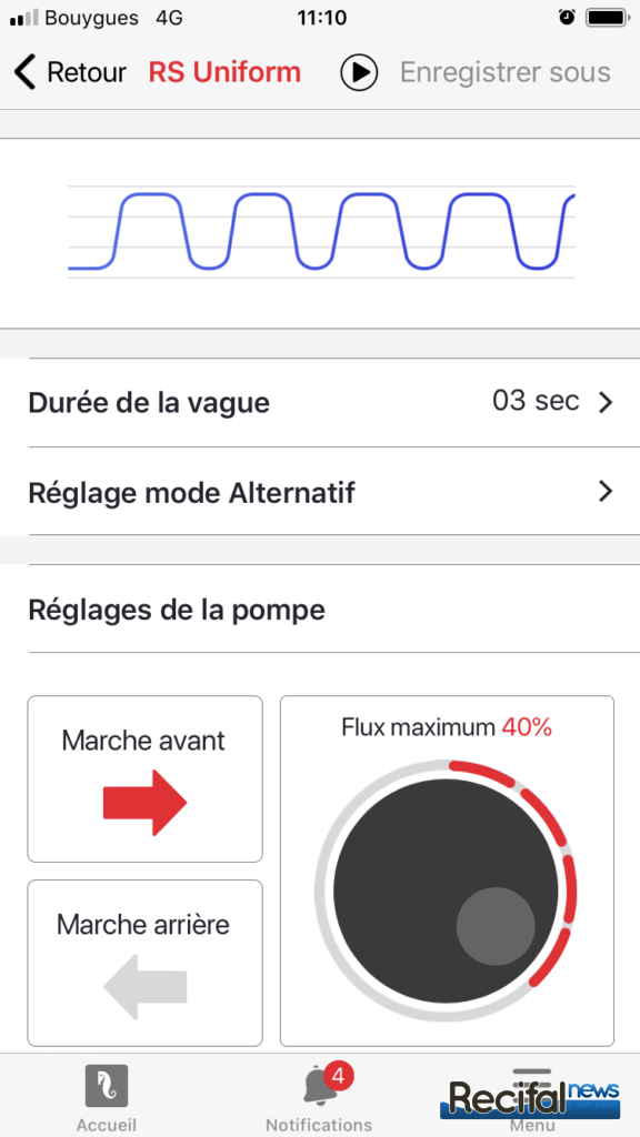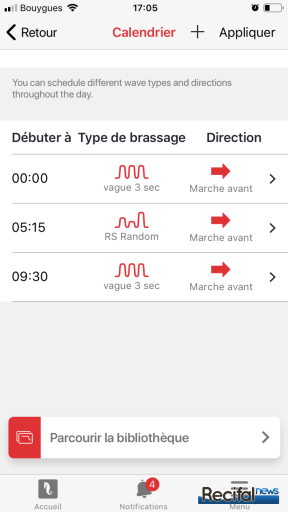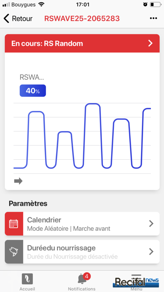 La Reef Wave apparaît maintenant dans le menu de l’aquarium auquel elle est connectée. Le mode de fonctionnement actuel est affiché. En cliquant sur la pompe, vous pourrez la piloter. Dans le menu de la pompe, vous pouvez jouer sur le brassage en cours, et depuis le calendrier, créer un programme de brassage sur la journée.