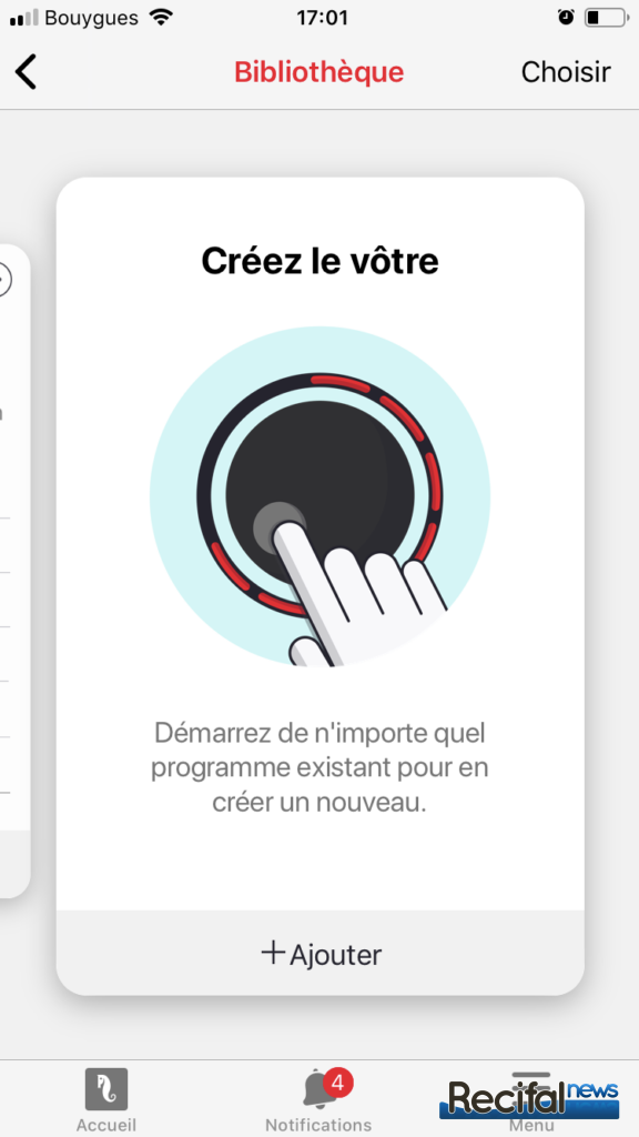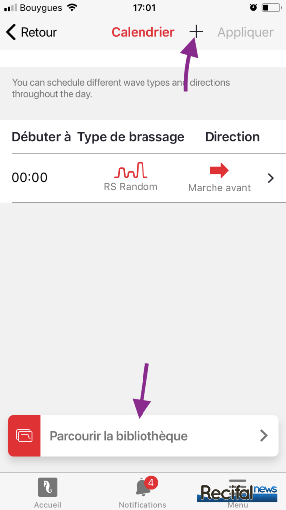Dans le menu « Calendrier », le « + » en haut à droite permet d’ajouter des réglages de brassage au cours de la journée. Vous pourrez choisir parmi les 5 préréglages existant (que vous pouvez ajuster), indiquer l’heure de démarrage du mode etc. Tout à droite du menu de sélection du mode de brassage voulu, il vous est possible de créer son propre mode.