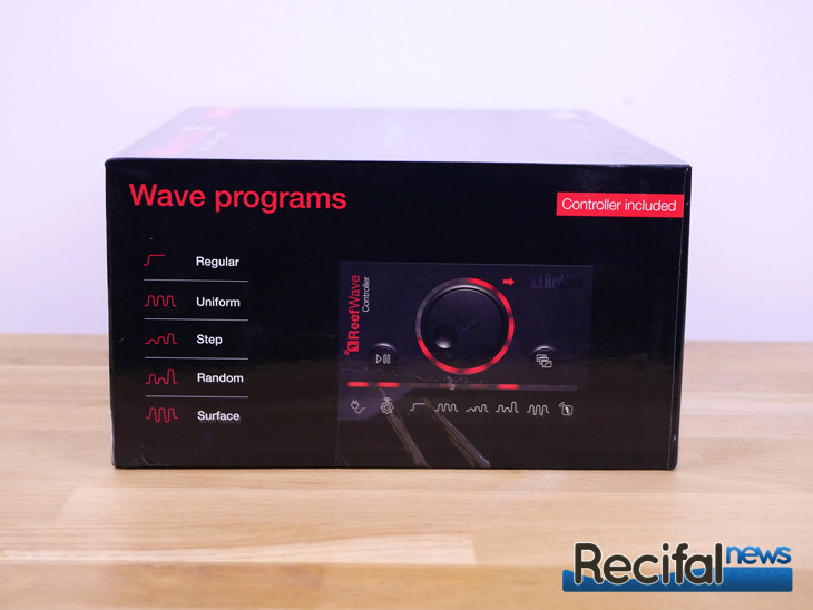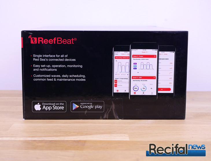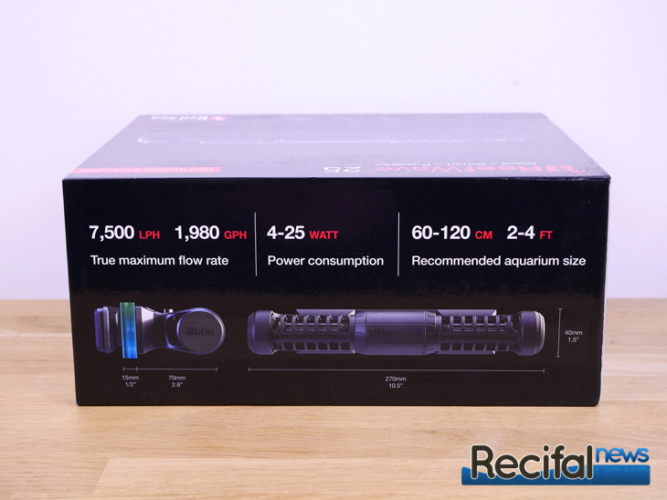 Pour guider au mieux l’aquariophile, un bon nombre d’informations se trouvent sur l’emballage : débit, consommation, recommandation de volume, dimensions, épaisseur de verre maximale, les 5 modes de brassage et la connectivité avec l’application Reefbeat en plus du boîtier de contrôle.