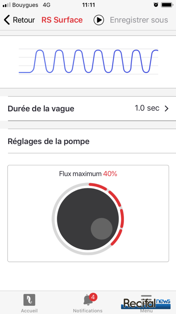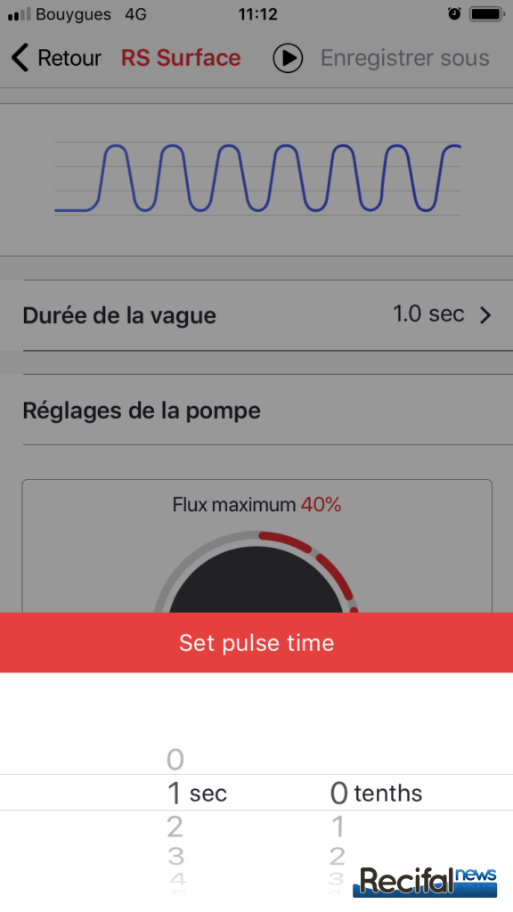 Installée dans un Reefer 170, j’ai pour ma part repéré que les modes vagues et vagues de surface étaient les plus adaptés à la configuration de l’aquarium et sa population, avec une puissance maximale de 40%. Jouer avec le boîtier m’a également permis de trouver son emplacement idéal : verticalement à l’arrière du pilier gauche.