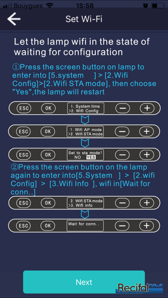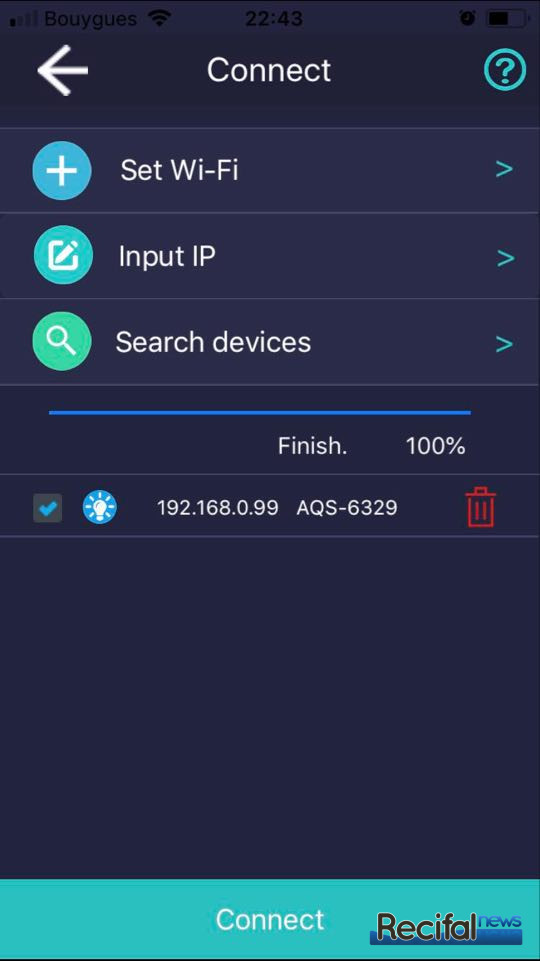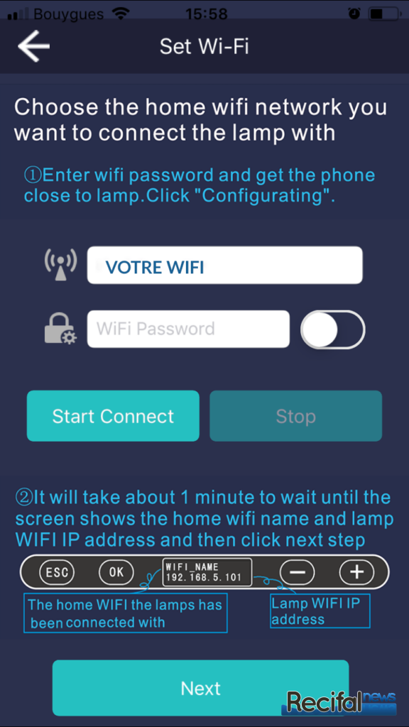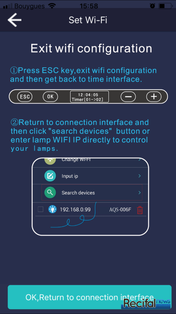 Connectez votre téléphone à votre réseau internet domestique puis retournez sur l’application et appuyez sur « Next ». Votre réseau apparaitra alors, et il vous faudra taper le mot de passe puis appuyez sur « Start connect ». Surveillez l’écran de la Series 6 : une adresse IP apparaitra. Notez là puis retournez sur l’écran d’accueil à l’aide du bouton « Esc ». Sur votre téléphone, retournez sur la page « Connect », et recherchez les appareils (« Search for devices »). Si la rampe n’apparaît pas, vous pouvez entrer manuellement son adresse IP que vous venez de noter précédemment. Vous pouvez maintenant piloter votre rampe depuis votre réseau domestique. Pour déconnecter la rampe de votre réseau domestique et réutiliser le réseau propre à la rampe, il faut repasser la configuration Wifi en mode AP :