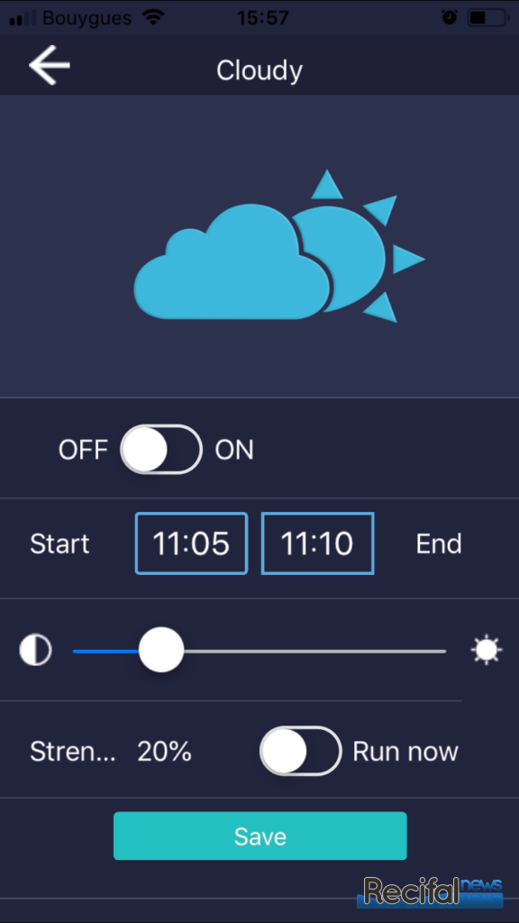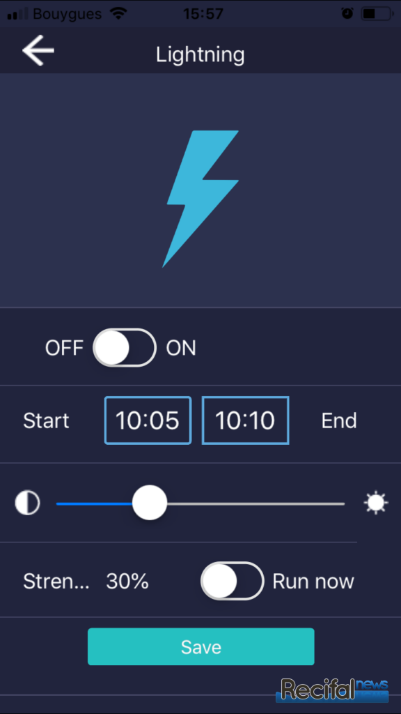 S’offrent à vous plusieurs options d’effets supplémentaires – des simulations d’orages (Lightning) et de passages nuageux (Cloudy) – que vous pouvez planifier sur une plage horaire et en régler l’intensité, un pilotage manuel (Manual), et donc le Timer pour la programmation quotidienne comme vu précédemment.