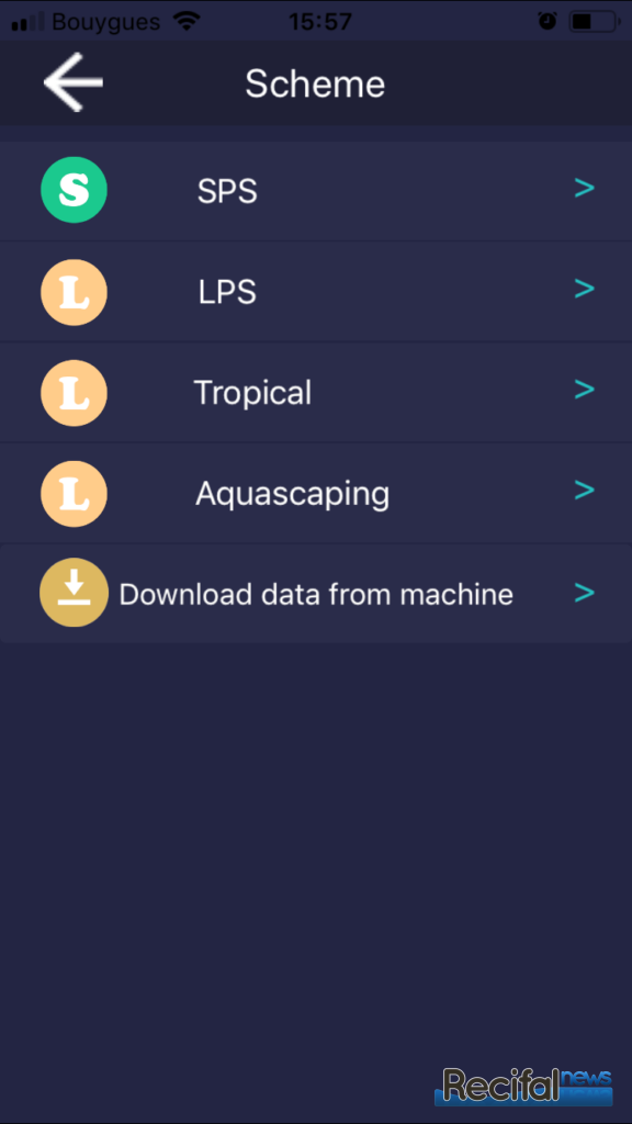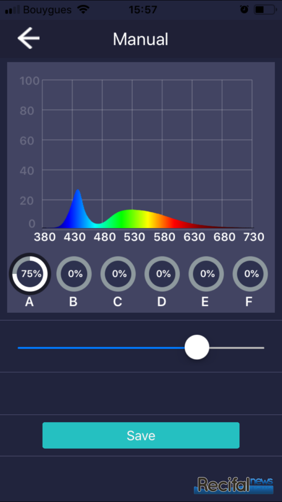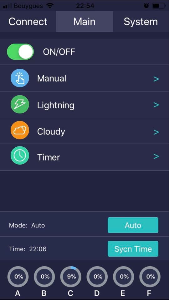 En bas de cette « Main » page est affiché l’état actuel de la rampe : mode (auto ou manuel), l’heure enregistrée sur l’appareil (si elle ne correspond pas, vous pouvez la synchroniser), et les pourcentages de chaque canaux à l’instant T.
