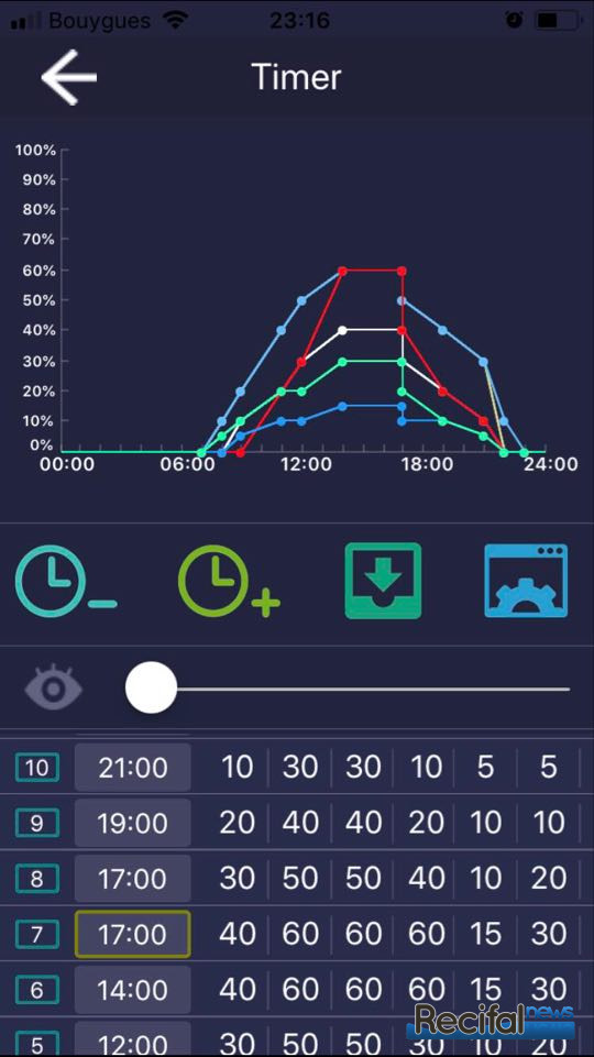 Vous arrivez alors sur la page « Timer » qui correspond à la programmation journalière de la rampe. Elle se compose comme telle : en haut, un graphique des différents canaux sur la journée en pourcentage, au milieu des boutons pour éditer le programme, en bas, la liste des créneaux horaires existants. Il est essentiel de comprendre ce système de créneau horaire pour programmer votre rampe comme vous le désirez. Tout d’abord, quelques informations clés :