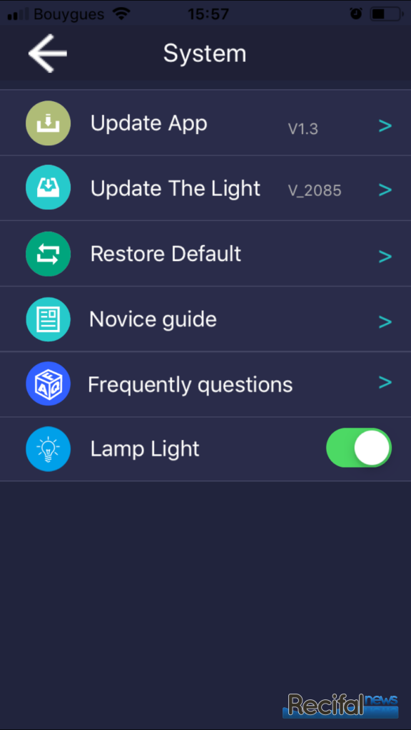 La page « System » vous envoie vers les infos techniques de l’appareil : version du firmware, version de l’application, retour aux paramètres d’usine, notice, questions fréquentes et un interrupteur ON/OFF.