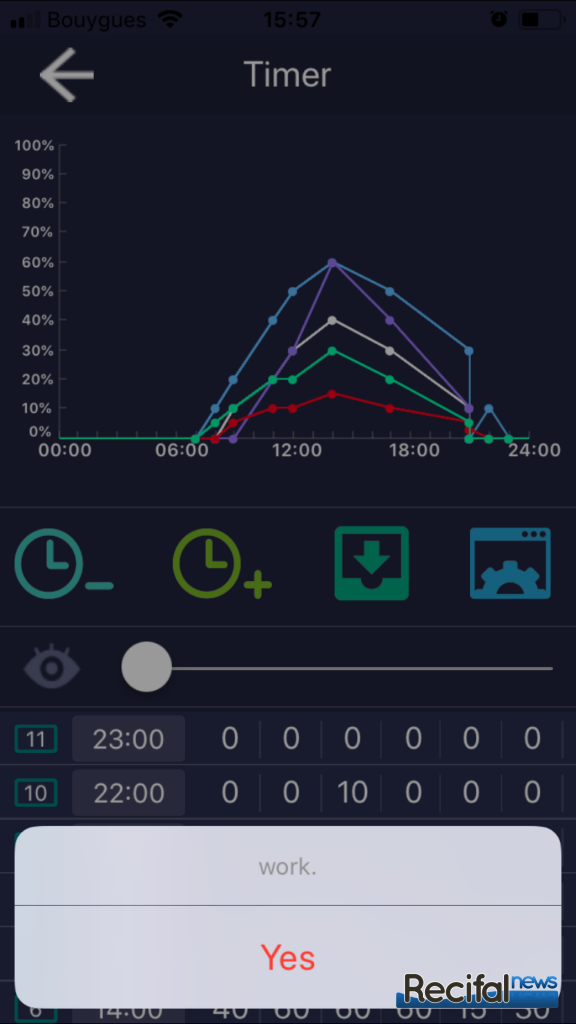 - La rampe s’éteindra totalement à la première ligne où tous les pourcentages redescendent à 0. Sur la deuxième capture d’écran ci-après, la rampe s’éteindra totalement à 23h, avec une décroissance du 3ème canal, dernier allumé à 22h, de 10% à 0.