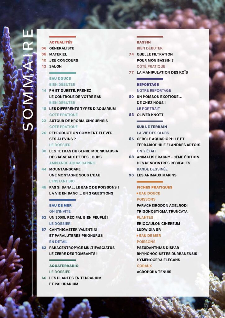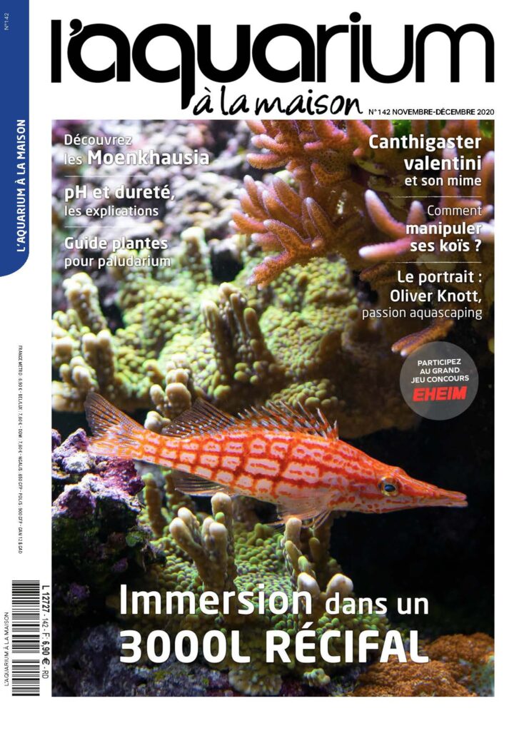 Le 142ème numéro du magazine L’aquarium à la maison arrive ! Ne le ratez pas chez votre revendeur aquariophile, votre point presse, ou notre mini boutique en ligne. Côté récifal, l’on découvre un aquarium récifal de 3 000 L majestueux, le Canthigaster valentini et son mime trompeur et le magnifique Paracentropyge multifasciatus.