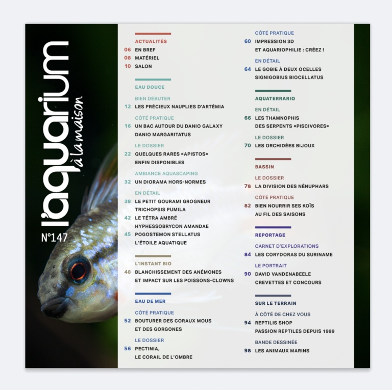 Le numéro de la rentrée du magazine aquariophile tout terrain (eau douce, eau de mer, bassin, aquaterrariophilie), le 147ème, est arrivé. Voici ce qui vous attend.
