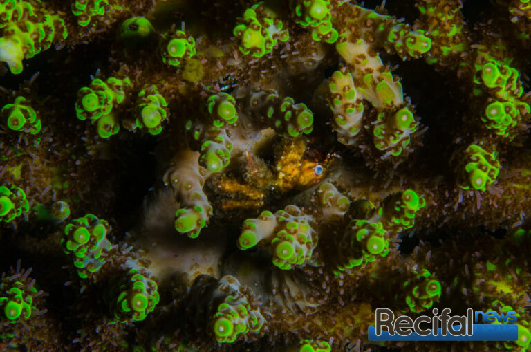 Il existe toute une faune de crustacés qui vivent associés aux colonies d’Acropora. La majeure partie d’entre eux ont une relation symbiotique mutualiste, dont les deux partis en tirent des avantages. Mais dans certaines circonstances, notamment lors de la captivité, cette relation peut devenir parasitaire. Elle devient donc néfaste pour l’un voire les deux partenaires. C’est le cas notamment du petit crabe velu aux yeux bleus que l’on trouve dans les colonies d’Acropora dans le milieu naturel. Leur nom commun est crabe ‘Godzilla’ ou Cymo melanodactylus. En temps normaux, il ne porte presque aucun préjudice au corail dans le milieu naturel. Mais, une fois en captivité, ou lorsque sa population devient trop nombreuse, pour des raisons pas très claires (probablement à cause d’un manque de nourriture), celui-ci se met à stresser, voire même dévorer son hôte. Et malheureusement, il devient donc nécessaire de les retirer des nouvelles colonies d’Acropora avant de les introduire dans l’aquarium.