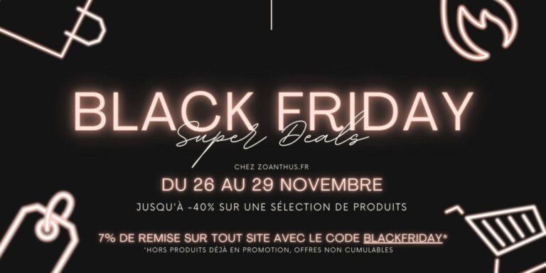 D’aujourd’hui au lundi 29 novembre, de nombreux produits sont réduits, jusqu’à -40 %. Sur les produits ne faisant pas partie de cette sélection, le code promo BLACKFRIDAY vous fera profiter d’une remise de 7 %.
