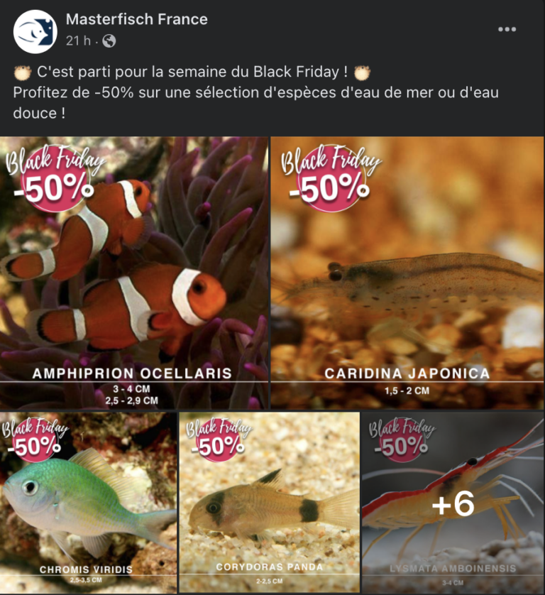Retrouvez une sélection de poissons et invertébrés, d’eau de mer et d’eau douce, avec une remise de 50 %, jusqu’au 1er décembre ! : www.masterfisch.fr/133-blackfriday