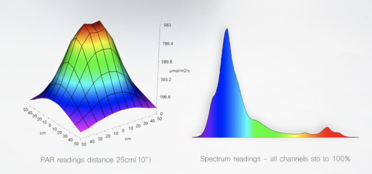 Cette rampe LED dispose d’une puissance totale de 215 W lorsque tous les canaux sont allumés à 100 %. Les LED sont disposées en X comme vous pouvez le voir ci-dessous. Aucune optique secondaire n’est utilisée pour optimiser le mélange des couleurs et n’induire aucune perte de puissance. Les 6 clusters sont disposés symétriquement de part et d’autre de la rampe et assurent une couverture optimale jusqu’à 80 x 80 cm, et peut être considérée comme satisfaisante jusqu’à 100 cm de long sur la même largeur si elle est suspendue suffisamment haut, d’après les tests de la marque. Son refroidissement est passif et donc totalement silencieux.