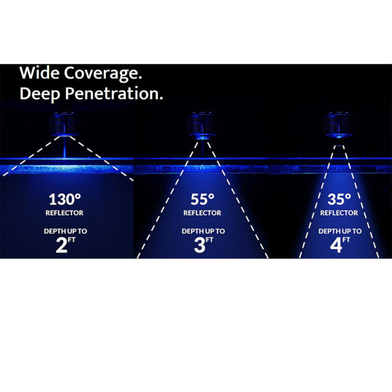 Qui dit plus de puissance, dit plus de possibilités. Son angle diffusion naturel de 130° permet d’éclairer jusqu’à 90 cm de côté et 60 cm de haut, même pour des coraux exigeants. Elle est vendue avec un cône de diffusion de 55° qui concentre le flux de sorte qu’elle convient pour un bac jusqu’à 90 cm de haut. Enfin, un diffuseur de 35° est vendu séparément et permet d’éclairer les bacs sur une hauteur de 1m20 (prix moyen 47 €).