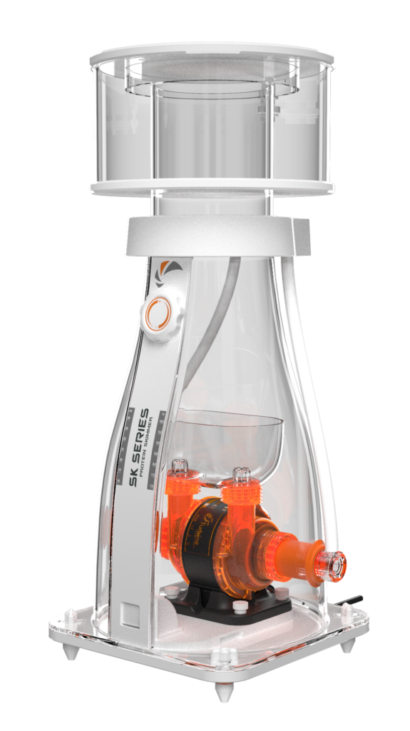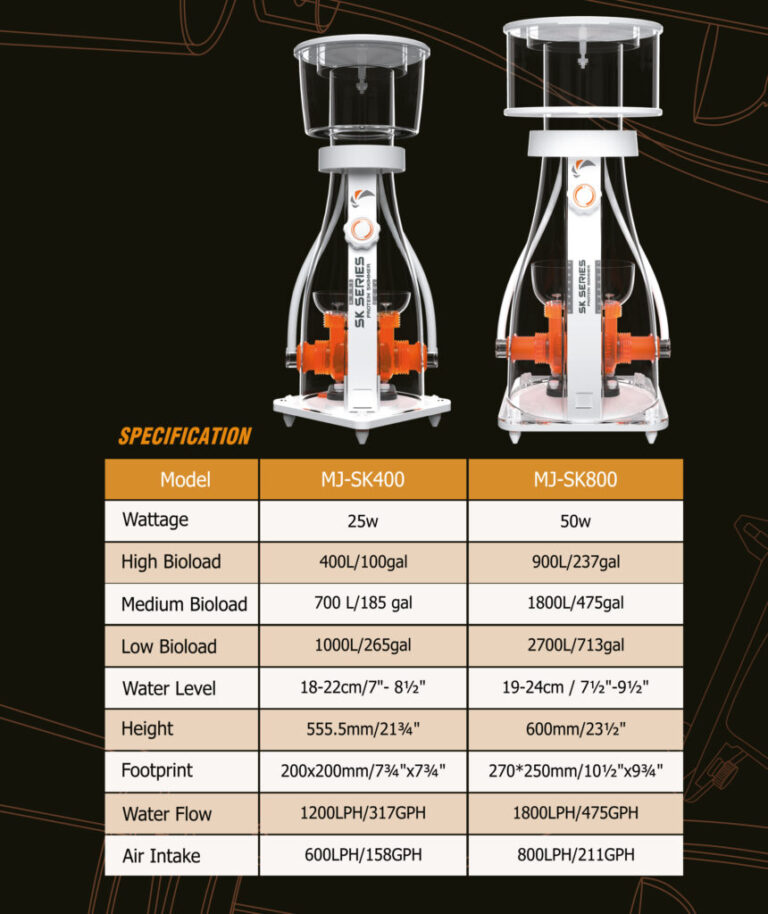Il reprend donc les bases du petit frère et premier sorti de la gamme, le MJ-SK400, en plus puissant ! Il dispose donc d’une pompe à double aspiration d’eau et donc deux roues à picots pour générer une très grande quantité de bulles d’air très petites, la prise d’air silencieuse se fait sur l’anneau du collet de l’écumeur, un interrupteur flotteur stoppe l’écumeur lorsqu’il s’emballe ou lorsque le godet est plein. Une molette facilement accessible permet d’ajuster le niveau dans le corps de l’écumeur en ouvrant/fermant une trappe. Enfin, la base est posée sur des pieds absorbants les vibrations.