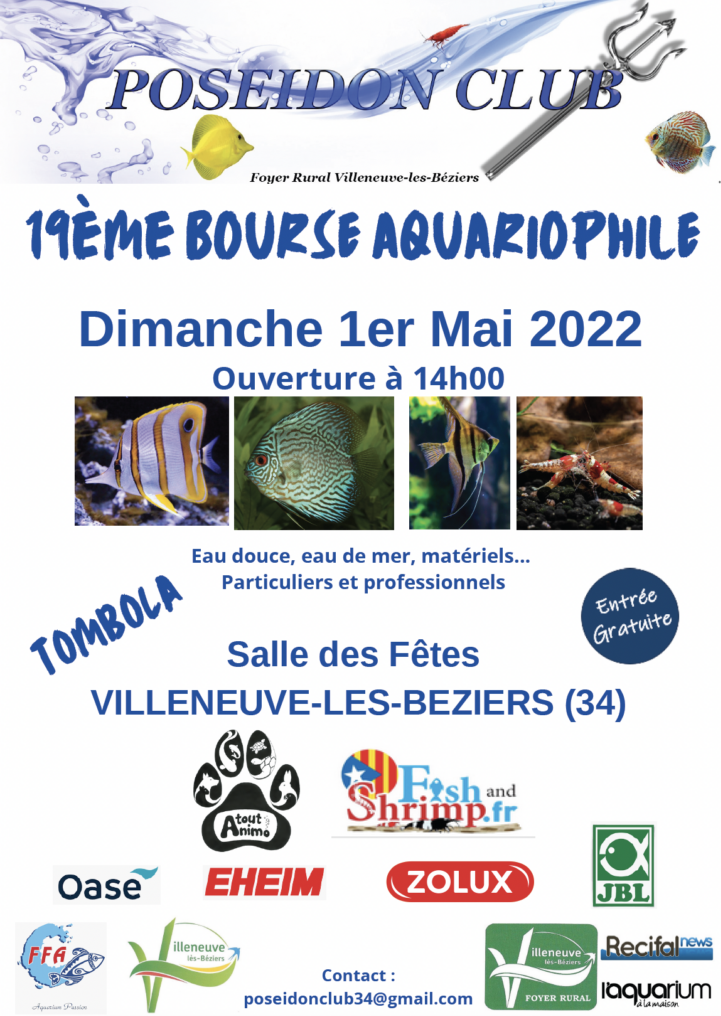 L’événement a lieu à la salle des fêtes de Villeneuv-les-Béziers (34) à partir de 14h. Particuliers et professionnels s’y rejoindront pour proposer leur matériel et le fruit des reproductions de leurs animaux et végétaux aquatiques (coraux, poissons, crevettes, plantes…).