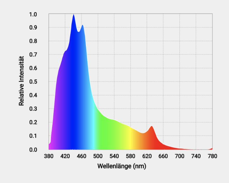 Six couleurs de LED sont utilisées : vert, rouge, bleu, blanch chaud, violet et UV. A pleine puissance, chaque LED consomme 1,5 W.