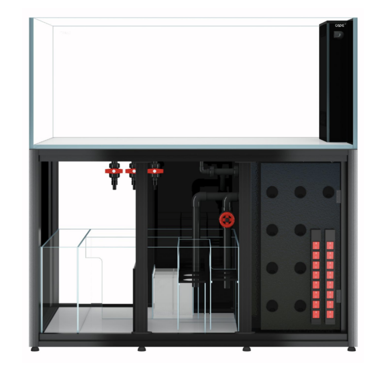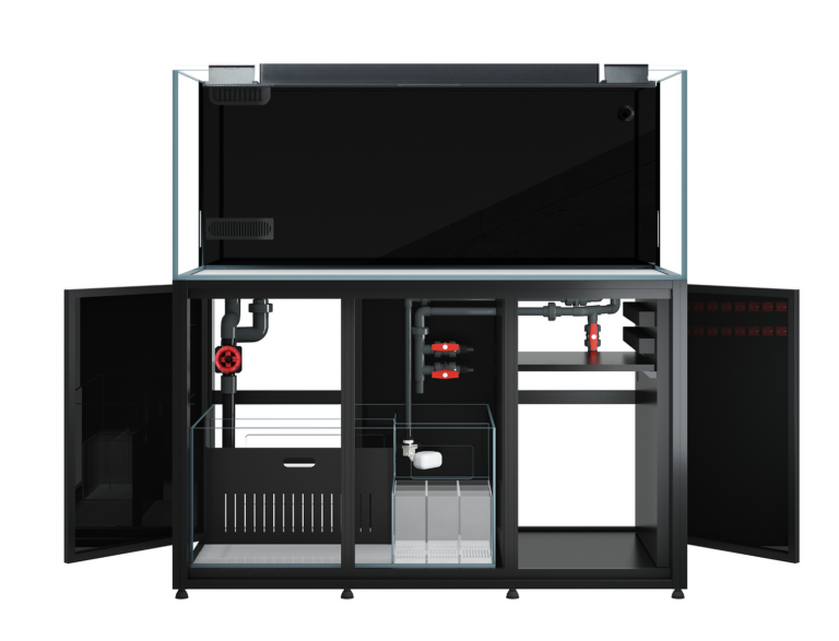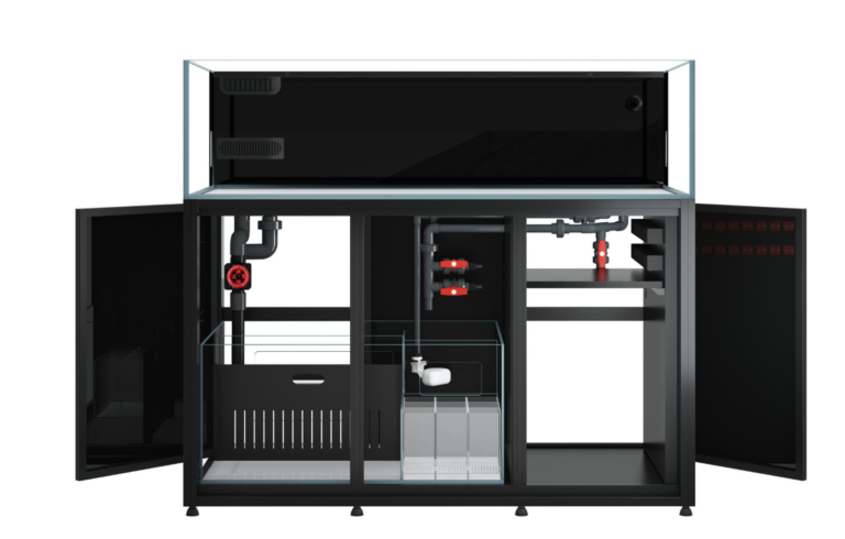 L’aquarium est donc en verre extra clair, équipé d’un filet anti-saut, la vitre du fond est teintée en blanc, l’arrière teintée en noir pour cachet la tuyauterie de descente, et la réserve d’osmosée intégrée à l’arrière de l’aquarium (et non dans le meuble comme il se fait habituellement !). L’aspiration se fait par une grille haute et une grille basse. Un ensemble de tuyauterie est livré avec, dont une vanne de précision et selon les modèles, les connexions pour un groupe froid, et des vannes sur le tuyau de descente pour alimenter divers appareils (réacteurs…). Enfin, la décantation offre les compartiments classiques, ainsi qu’une paroi amovible pour créer un refuge à algues si vous le désirez.